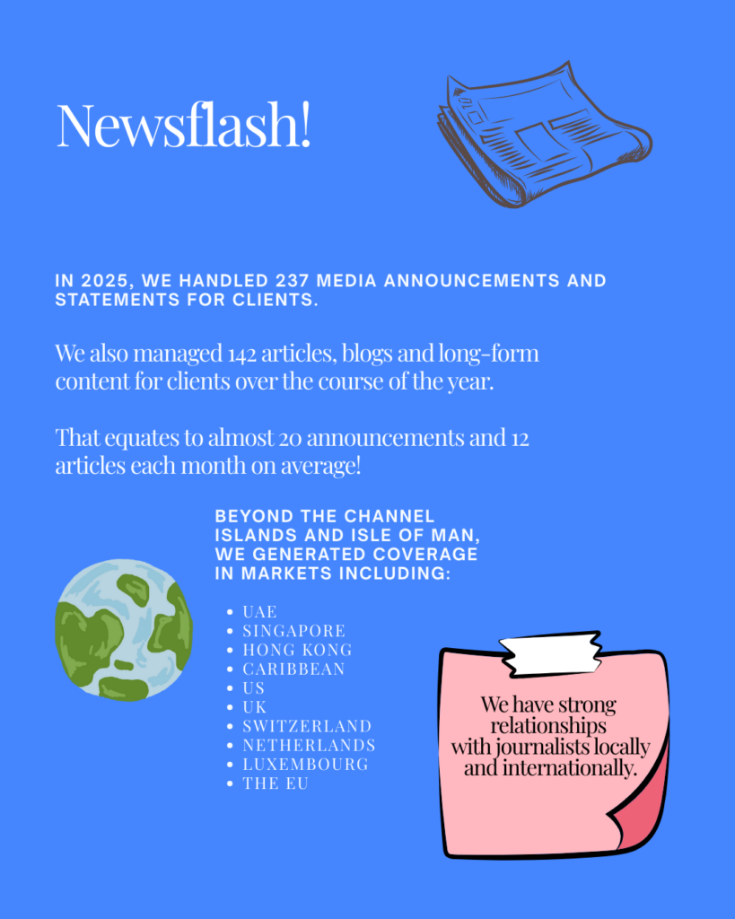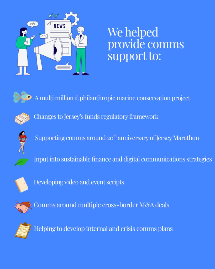 In particular, the team has supported communications support around a number of key initiatives and projects, including a multi million £ philanthropic marine conservation project, major changes to Jersey’s funds regulatory framework and the 20th anniversary of the Jersey Marathon.